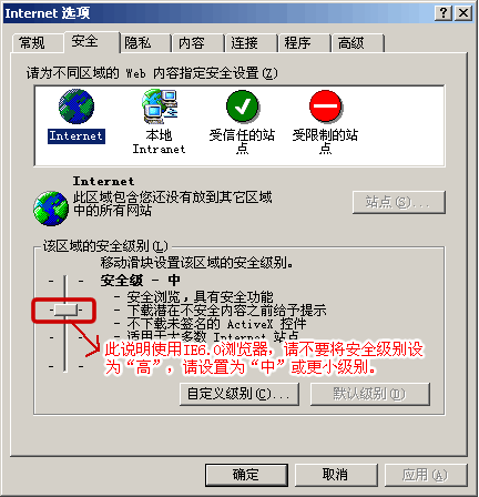 如果您的瀏覽器版本比較低,請(qǐng)升級(jí)。 如果您的瀏覽器是5.0以上版本,也許是您的瀏覽器安全級(jí)設(shè)置過高。您可以點(diǎn)擊瀏覽器“工具”菜單中的“Internet 選項(xiàng)”,進(jìn)入后選擇“安全”,詳細(xì)設(shè)置請(qǐng)看以下圖: