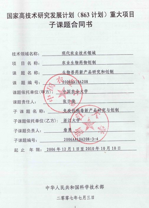 《免疫抗病毒新產(chǎn)品研究與創(chuàng)制》—863課題