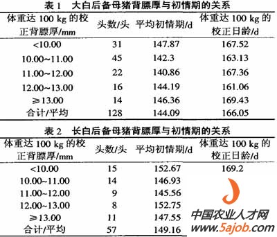 1.2 試驗(yàn)方法 后備母豬第一次發(fā)情作為它的初情期,記錄每次發(fā)情的日期,后備母豬沒有用公豬誘情。背膘厚是按照國家測定要求,在后備母豬達(dá)到8O~105 kg時(shí),用超聲波背膘儀進(jìn)行活體測定,測定部位為后備母豬倒數(shù)3~4肋,距背中線3~5 cm處。