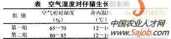3 哺乳母豬的管理技術(shù) 哺乳母豬舍一定要保持清潔、干燥和通風(fēng)良好。冬季注意保璦,防止賊風(fēng)(穿堂風(fēng))襲擊。母豬舍骯臟、潮濕,常是母、仔患病的誘因。特別是產(chǎn)房內(nèi)空氣濕度大,會(huì)使仔豬患病并影響增重。見下表