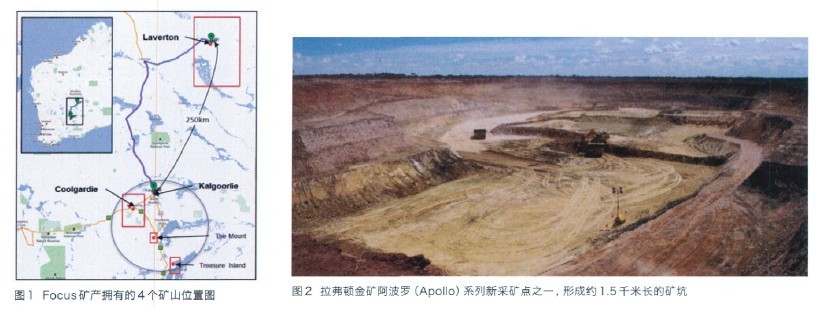 澳大利亞Focus 礦產(chǎn)有限公司( 英文全稱:Focus MineralsLtd,ASX :FML,以下簡稱Focus 礦產(chǎn)) 是澳大利亞最有活力的黃金生產(chǎn)商之一,在橫跨澳大利亞的兩個(gè)最大黃金生產(chǎn)區(qū)——庫爾加迪( Coolgardie)黃金成礦帶和西澳大利亞的拉弗頓(Laverton)地區(qū)中,擁有四個(gè)生產(chǎn)礦山,如圖1 所示。Focus 礦產(chǎn)也是一家勘探和開發(fā)公司,專注于成為一家重要的黃金和鎳的生產(chǎn)企業(yè)。其公司發(fā)展?jié)摿Ρ憩F(xiàn)如下: