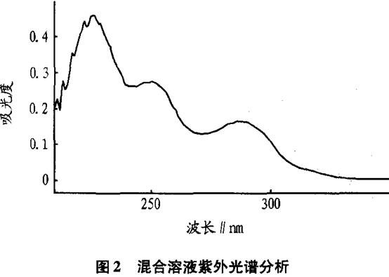 1.2.3測定波長的選擇。用流動相配制0. 02 mg/ml 2一甲硫基4-氨基-5-嘧啶甲醛及0.01  mg/ml 2-甲硫基-4-氨基-5-嘧啶甲醇的混合溶液,以流動相為空白,在210~ 350 nm范圍內(nèi)掃描空白與混合溶液,確定最佳測定波長。