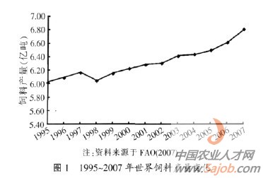 飼料總量增長變慢, 飼料工業(yè)產(chǎn)品結(jié)構(gòu)調(diào)整,產(chǎn)品科技含量加大, 飼料生產(chǎn)經(jīng)營與飼養(yǎng)趨于一體化,同時,政府就飼料加工企業(yè)對環(huán)境的污染和飼料產(chǎn)品中含有害物質(zhì)的殘留量提出了嚴格的控制標準及處罰辦法。隨著世界人口規(guī)模的變化及人們生活水平的提高,全球經(jīng)濟的持續(xù)發(fā)展將促使人們擴大畜牧業(yè)的生產(chǎn)規(guī)模,全球飼料業(yè)也將隨之增加生產(chǎn)規(guī)模。據(jù)《國際飼料》的數(shù)據(jù)顯示,全球大型、綜合性飼料企業(yè)2007 年的飼料總產(chǎn)量出現(xiàn)了明顯的增長。盡管原料價格持續(xù)飆升、動物疫病不斷發(fā)生,這些因素阻礙飼料總產(chǎn)量的增長, 但是全球工業(yè)飼料2007 年總產(chǎn)量的漲幅超過了3.5%。圖1 表明了1995~2007 年世界飼料產(chǎn)量的變化趨勢,2007 年世界飼料產(chǎn)量達到了6.8 億噸。