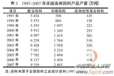 1.3 第三階段:飼料產(chǎn)業(yè)調(diào)整階段 此階段實質(zhì)是飼料產(chǎn)業(yè)從成長階段逐步邁向成熟階段。其總體特點是:飼料總量增長緩慢,飼料產(chǎn)品結構調(diào)整,產(chǎn)品中科技含量逐步加大,飼料人才素質(zhì)進一步提高, 產(chǎn)品質(zhì)量安全管理體系不斷完善,產(chǎn)品質(zhì)量進一步提高,飼料行業(yè)競爭激烈并且趨于微利,大型集團化企業(yè)穩(wěn)步發(fā)展,飼料安全性日益被重視,飼料業(yè)發(fā)展仍處于區(qū)域發(fā)展不平衡狀況。我國飼料工業(yè)經(jīng)過30 年的發(fā)展, 取得了令人矚目的成績。我國的飼料工業(yè)為農(nóng)業(yè)結構調(diào)整、農(nóng)民增收以及養(yǎng)殖業(yè)的持續(xù)發(fā)展作出了積極貢獻。2006 年進入“十一五”時期后,我國飼料業(yè)經(jīng)歷了禽流感、畜產(chǎn)品價格震蕩、飼料原料價格上漲等不利因素的嚴峻考驗, 飼料工業(yè)在生產(chǎn)波動中保持平穩(wěn)。2007 年,全國飼料工業(yè)總產(chǎn)量1.23 億噸,占世界總產(chǎn)量近1/5,其中配合飼料9 319 萬噸,濃縮飼料2 491萬噸,添加劑預混合飼料521 萬噸(見表2)。