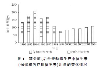 荷蘭從1998年到2006年間,就逐漸禁止了應(yīng)用保健類抗生素;但抗生素的應(yīng)用總量和禁用前保持相當(dāng)水平,這表明保健用抗生素減少了,而實際上治療用抗生素的用量增加了。瑞典和丹麥早幾年前就終止了抗生素的應(yīng)用。丹麥1999年末就終結(jié)了保健用抗生素的應(yīng)用。禁用保健用抗生素后,對斷奶后幼仔豬腹瀉處理用抗生素的量卻明顯增多,并因此導(dǎo)致幼仔豬的生產(chǎn)率有所下降。而對于肉雞來說,禁令生效前通常易發(fā)的壞死性腸炎之所以沒有引起大的健康問題,主要原因是一直允許肉雞生產(chǎn)者繼續(xù)應(yīng)用預(yù)防壞死性腸炎和抗球蟲病的離子載體藥物的緣故。禁用后對飼料效率的影響不大,據(jù)報道飼料效率降低了2.3%?股氐目傁牧繌1994年的206t(活性成分)明顯減少到了2003年的102t(見圖1),