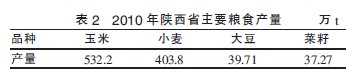 陜西省是一個農(nóng)業(yè)大省,農(nóng)業(yè)生產(chǎn)總值在全省國民生產(chǎn)總值中占有相當大的比重。飼料工業(yè)作為種植業(yè)的下游產(chǎn)業(yè),其社會功能就是將種植業(yè)生產(chǎn)的糧食通過科學配方加工成配合飼料,實現(xiàn)養(yǎng)殖業(yè)的效益最大化和糧食的高效轉化。目前,陜西省糧食除了滿足口糧需求和工業(yè)淀粉、酒精加工等以外,其余糧食及其副產(chǎn)品均轉化為飼料。2010年陜西省糧食總產(chǎn)量達到1164.9萬t,其中與飼料工業(yè)生產(chǎn)密切相關的糧食品種主要有玉米、小麥、大豆、菜籽等(表2),
