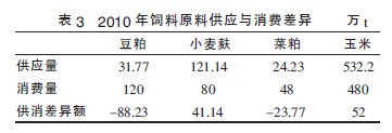 它們或直接被用作飼料、或經(jīng)加工轉化后用作飼料。如果陜西省生產(chǎn)的糧食及其產(chǎn)生的副產(chǎn)品全部轉化并用做飼料,那么2010年陜西省可提供飼料用玉米532.2萬t,麩皮次粉121.14萬t,豆粕31.77萬t,菜粕24.23萬t。但是這些產(chǎn)量相對于陜西省飼料工業(yè)生產(chǎn)需求來說仍不能得到滿足,表3是對陜西省飼料用糧、飼料原料需求與供應差異分析。數(shù)據(jù)顯示,陜西省大宗原糧玉米、小麥供應充足,能滿足飼料用糧需要。蛋白質原料缺口較大,其中豆粕缺口高達73.5%。這是因陜西省農(nóng)業(yè)生產(chǎn)以玉米、小麥種植為主,而油料作物種植面積較小。