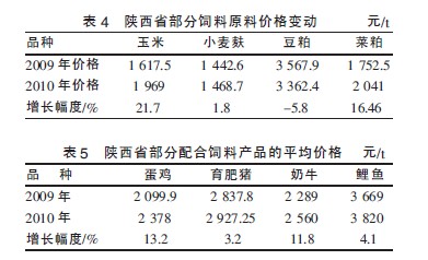 從表中可以看出,陜西省糧食調查數(shù)據(jù)顯示2010年玉米價格較上年增長28.88%,而飼料用玉米價格較上年增長21.7%;小麥價格增幅為10%,而它的副產(chǎn)品小麥麩的價格增長幅度為1.8%。飼料用玉米、小麥麩的價格變動隨著陜西省糧食價格的變動而發(fā)生變動。而豆粕和菜粕的價格變動與陜西省大豆、菜籽的價格變動不相吻合,主要是因為豆粕和菜粕陜西省供應量不足,大量靠外地調運,受市場因素影響大,本地飼料用糧價格對這部分飼料原料價格影響較小。因為配合飼料最能反映飼料糧的使用情況,所以我們調查了陜西省部分配合飼料產(chǎn)品的平均價格。從表4和表5數(shù)據(jù)的對照可以看出,飼料原料以及飼料產(chǎn)品的價格變動與糧食價格的變動成正比,因為蛋雞配合飼料、育肥豬配合飼料使用玉米量占到產(chǎn)品的60%,玉米價格上漲超過20%,導致飼料產(chǎn)品價格隨之上漲。但是從表4和表5的數(shù)據(jù)對比,飼料價格上漲幅度達不到飼料用糧價格上漲幅度,飼料產(chǎn)品價格的上漲并非飼料企業(yè)為了擴大利潤率而上調產(chǎn)品價格,飼料產(chǎn)品價格的上漲是由于飼料成本上漲引起的,并非企業(yè)人為所致。