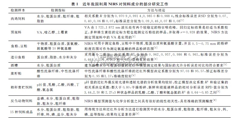 近紅外光譜技術(shù)在飼料成分的定量分析應(yīng)用是近紅外光譜技術(shù)使用中人們最為熟知的一面。國外學(xué)者利用近紅外光譜技術(shù)對(duì)飼料的常規(guī)營(yíng)養(yǎng)成分分析已做了大量的研究。我國近紅外光譜技術(shù)研究起步較晚,但在近幾年已取得了不少的成績(jī),主要包括:飼料的常規(guī)營(yíng)養(yǎng)成分分析、飼料中氨基酸的測(cè)定、礦物元素的檢測(cè)以及有毒有害物質(zhì)的檢測(cè)等幾個(gè)方面,所做的部分工作見表1。