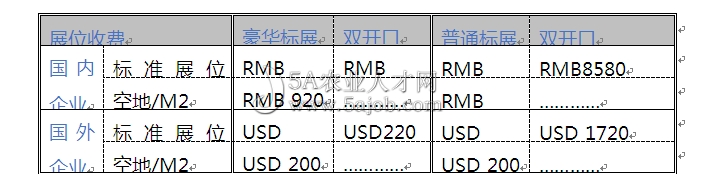 注:1.標準展位包括地毯、三面圍板、公司名稱楣板、咨詢桌一張、折椅兩把、 射燈兩盞、電源插座一個(特殊用電請事先說明,另行收費)。