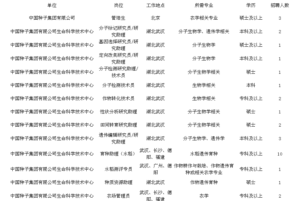 中國種子集團有限公司及下屬公司2017年校園招聘崗位匯總表