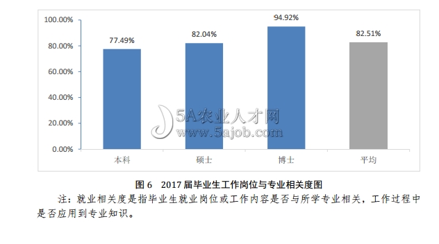 根據(jù)北京高校畢業(yè)生就業(yè)指導中心對中國農(nóng)業(yè)大學 2017 屆畢業(yè)生進行的抽樣調查顯示,2017 屆畢業(yè)生專業(yè)相關度平均為 82.51%,比上一年度有所提升。從學歷來看,博士畢業(yè)生就業(yè)相關度最高,為 94.92%,其次為碩士畢業(yè)生,為82.04%。畢業(yè)生就業(yè)相關度與學歷成正比,學歷越高,就業(yè)相關度越高,見圖6。
