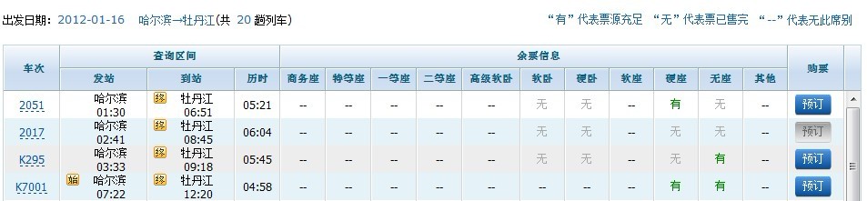 3.下面就要去“搶票”了,點(diǎn)擊左上角日期下面的“車(chē)票預(yù)定”按鈕,選擇“出發(fā)地”,“目的地”用簡(jiǎn)拼去填寫(xiě),然后用箭頭或者鼠標(biāo)去選擇對(duì)應(yīng)城市,例如出發(fā)地哈爾濱就輸入:heb,然后下箭頭選擇,回車(chē)確定即可。選擇好出發(fā)日期,最早是可以提前12天預(yù)定的,例如5號(hào)是可以訂16號(hào)的票,6號(hào)是可以訂17號(hào)的票,以此類(lèi)推。輸入完成后,點(diǎn)擊“查詢(xún)”按鈕,“正在查詢(xún),請(qǐng)稍候!”過(guò)后就可以看到車(chē)次列表了,以及余票信息,例如下面的: